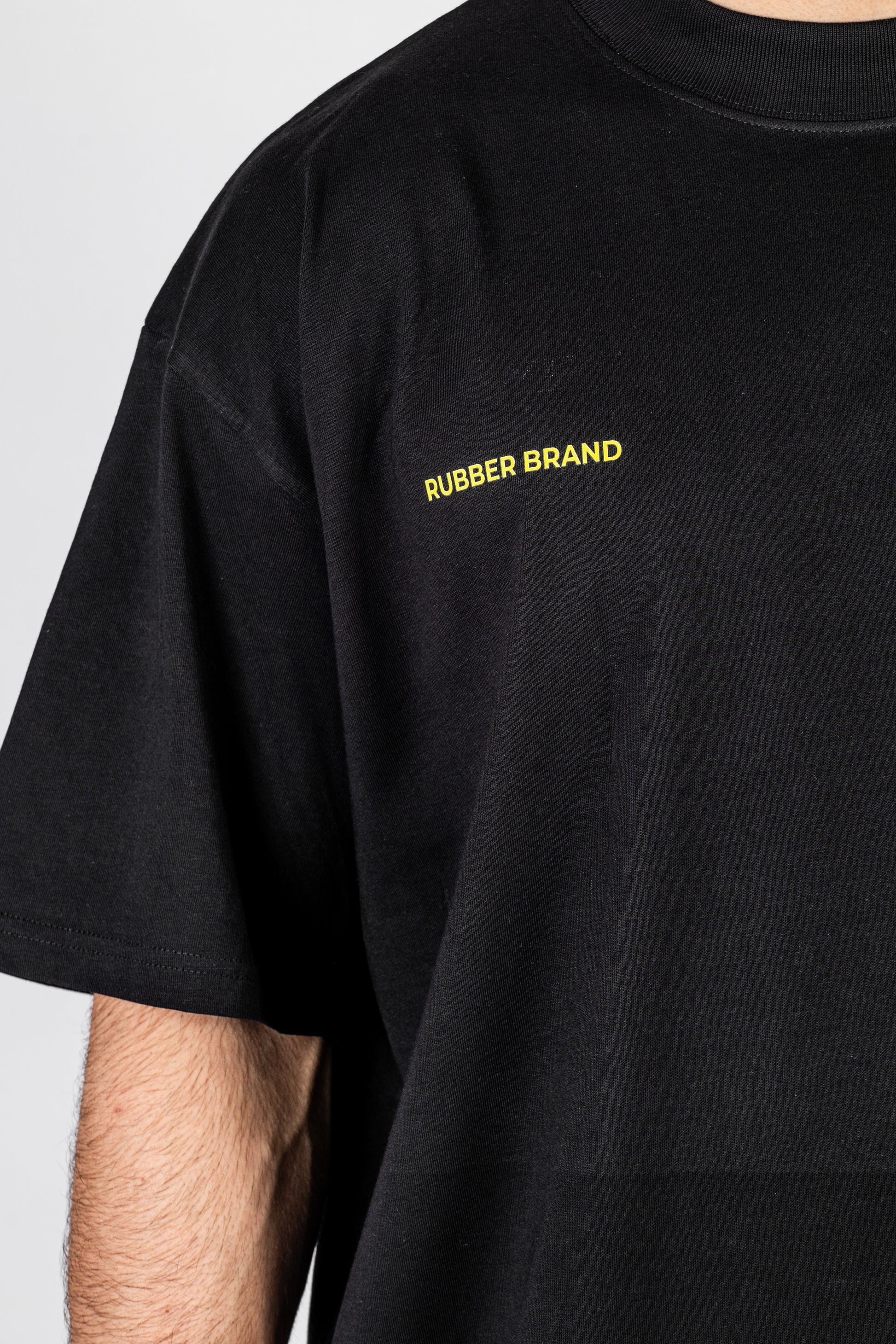 Graphic design on the back with typographic repetition in fluorescent yellow vinyl and Rubber Brand logo detail at the top.